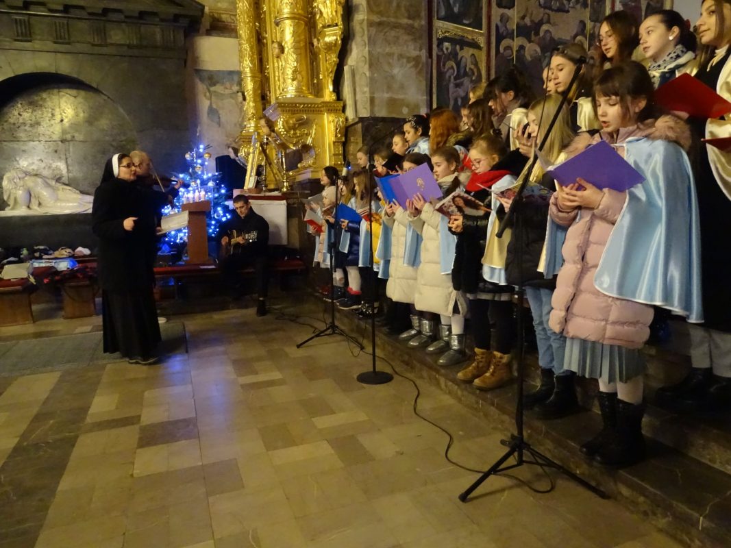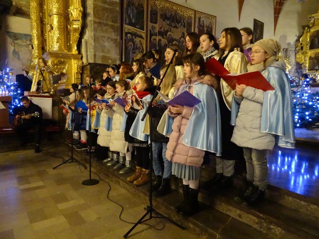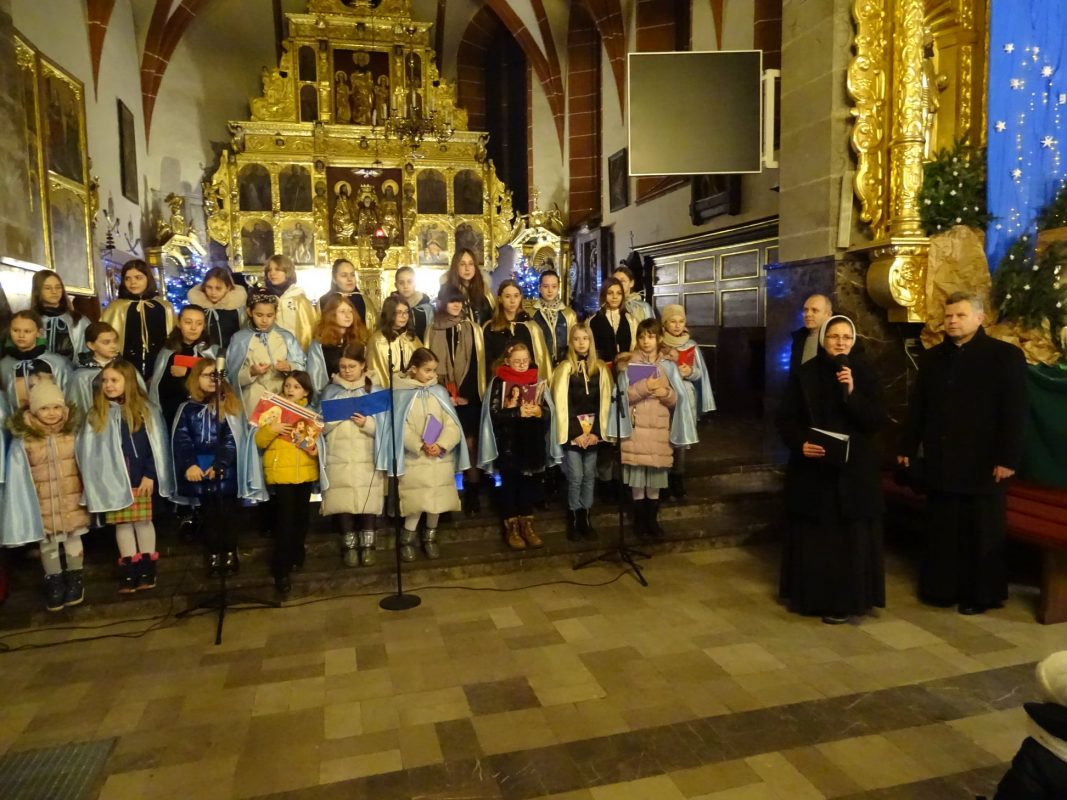 W niedzielne popołudnie 16.01.2022 r. dziewczynki pod opieką s. Ewy Górlickiej, Andrzeja Buczka i Cezarego Szymkiewicza zaśpiewały tradycyjne kolędy oraz wesołe pastorałki, by dziękować Narodzonemu Jezusowi za dar Jego przyjścia na ziemię, jak również podzielić się Bożym darem, jakim jest śpiew. Do tego wydarzenia przyłączyło się wielu mieszkańców parafii uczestniczących w kolędowym koncercie. Piękny śpiew i akompaniament instrumentalny zostały nagrodzone długimi brawami, a także słowami wdzięczności ze strony ks. Proboszcza Marka Kucharskiego.
