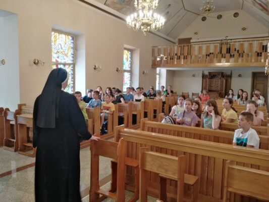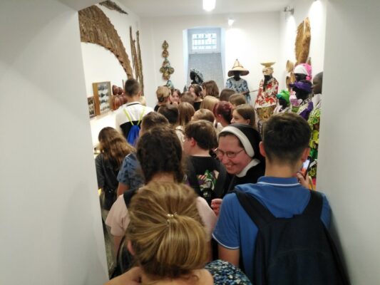 Młodzi pielgrzymi obejrzeli stroje, ozdoby, maski, instrumenty muzyczne, przedmioty codziennego użytku, zabawki oraz obrazy, a także dokumentację pracy misyjnej Michalitek. Swą wizytę uczniowie potwierdzili wpisami w pamiątkowej księdze gości.