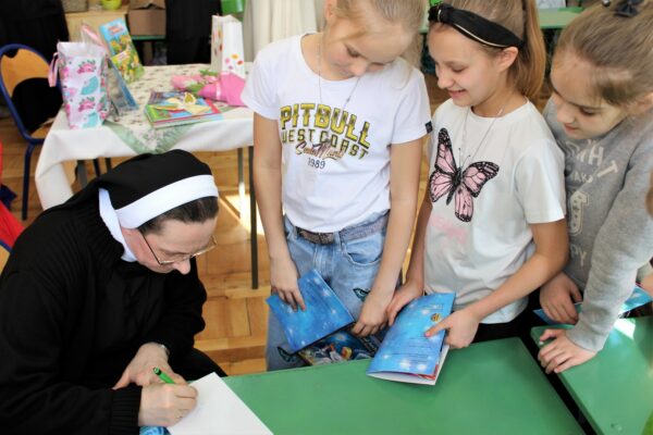 Podczas spotkania Siostra Eliza pokrótce opowiedziała dzieciom o swojej działalności literackiej poświęconej dzieciom, przedstawiła i zaprezentowała dotychczas wydane książki,