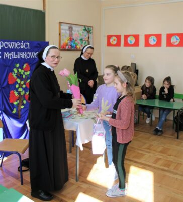 i autografów. Było to prawdziwie dobrze przygotowane i budujące spotkanie. „Opowieści z Malinkowa” są książką o postawach i wartościach w jakich wzrastają dzieci w procesie dobrego wychowania. Dzieci mogły zaopatrzyć się w ten życiowy podręcznik, który jest pouczający nie tylko dla najmłodszych. Spotkanie zakończyły podziękowania i symboliczne kwiaty dla Siostry – pisarki s. Elizy Włodyka. Dzieci zaśpiewały też piosenkę, która pochodzi z treści książki.